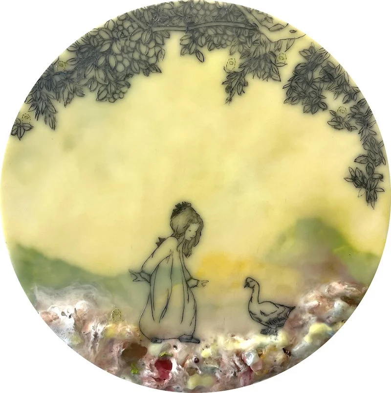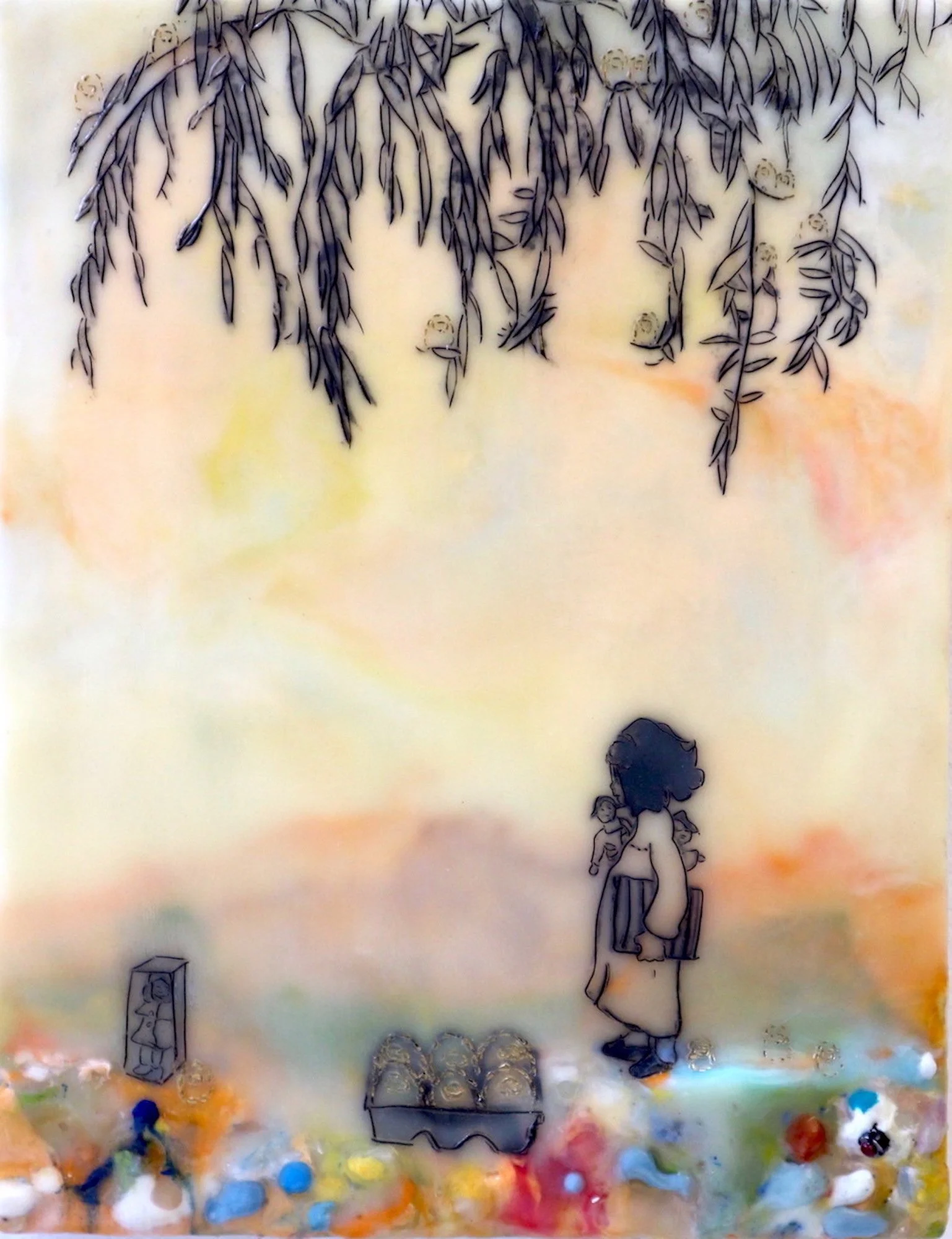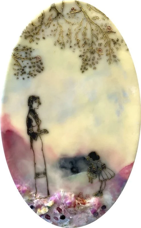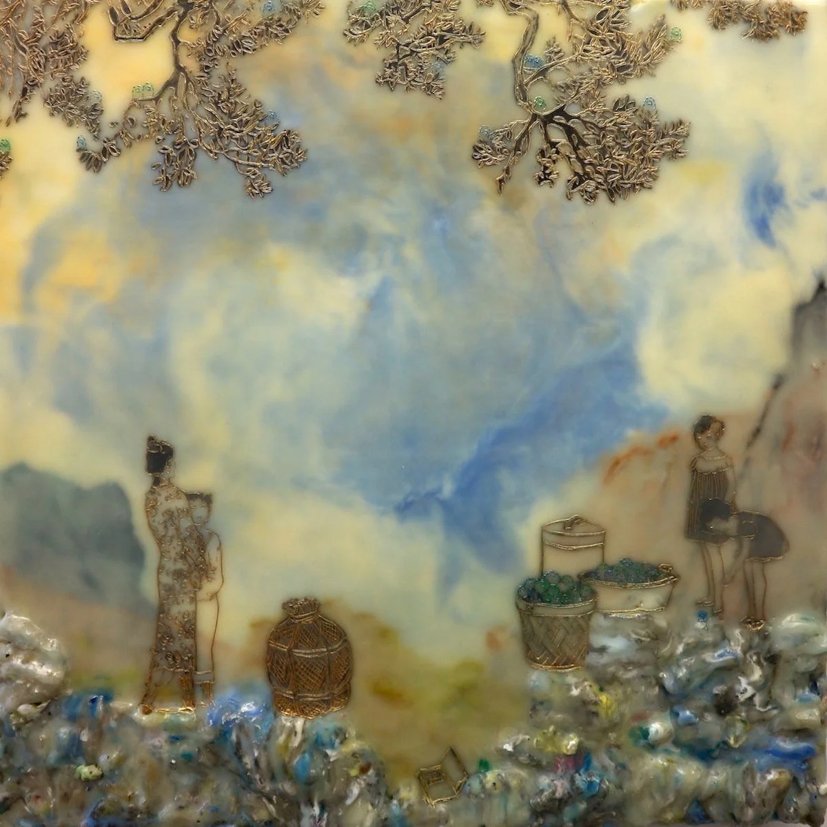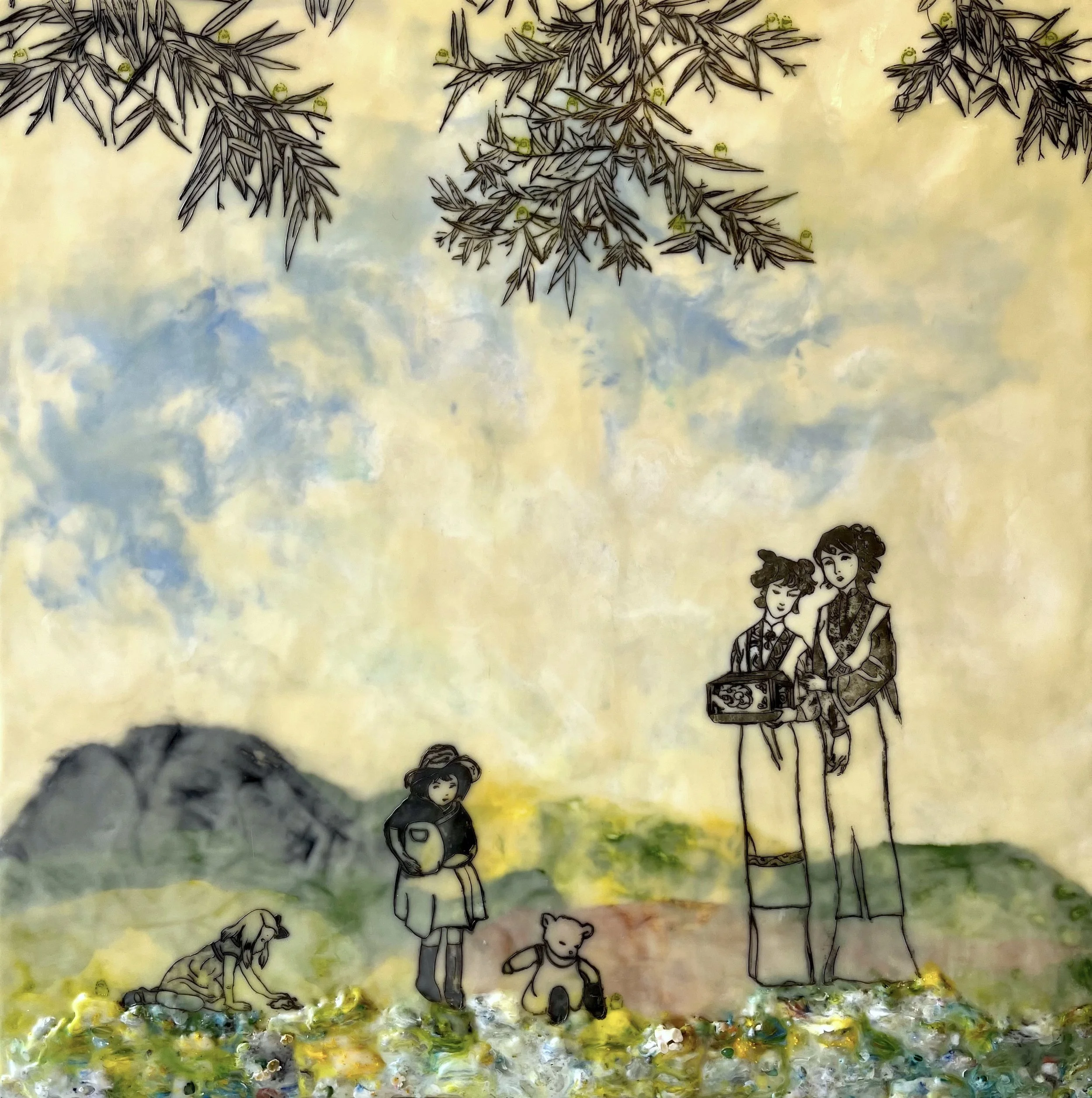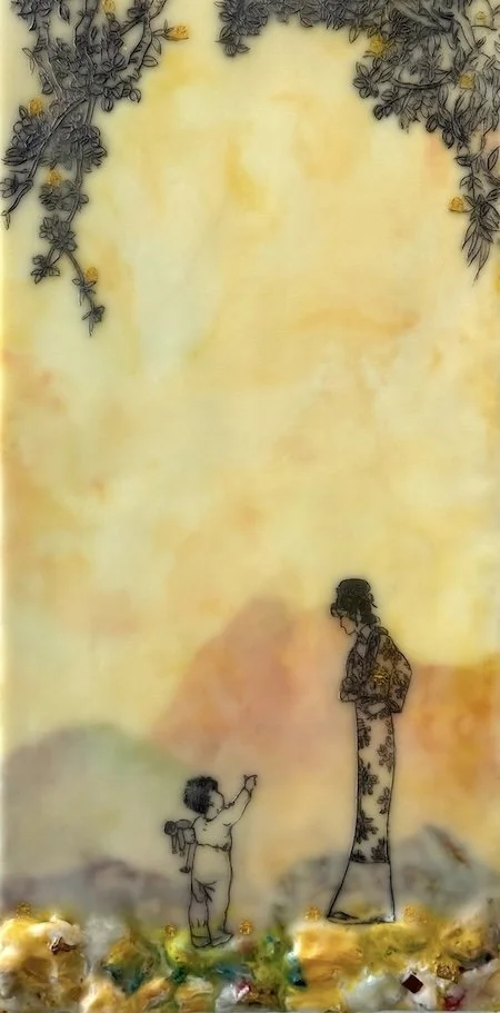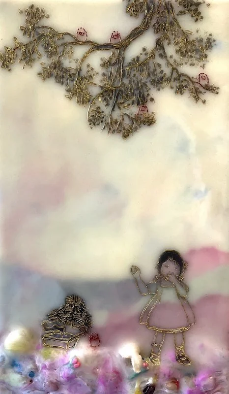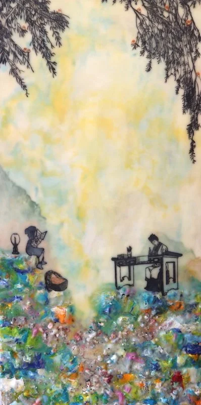 To address the process of cultural encounter and entanglement, encaustic on wood panels are used to create cross-cultural narratives by juxtaposing appropriated images from vintage children’s books and other found images. Mixed Media include pigments from Morocco and India, volcanic ash from Ecuador, rice paper, metallic leaf, beads and circuit board components. Each material becomes a cultural signifier. Each painting contains 25 to 30 layers of encaustic, metaphorically representing layering of cultures, identities, and places.