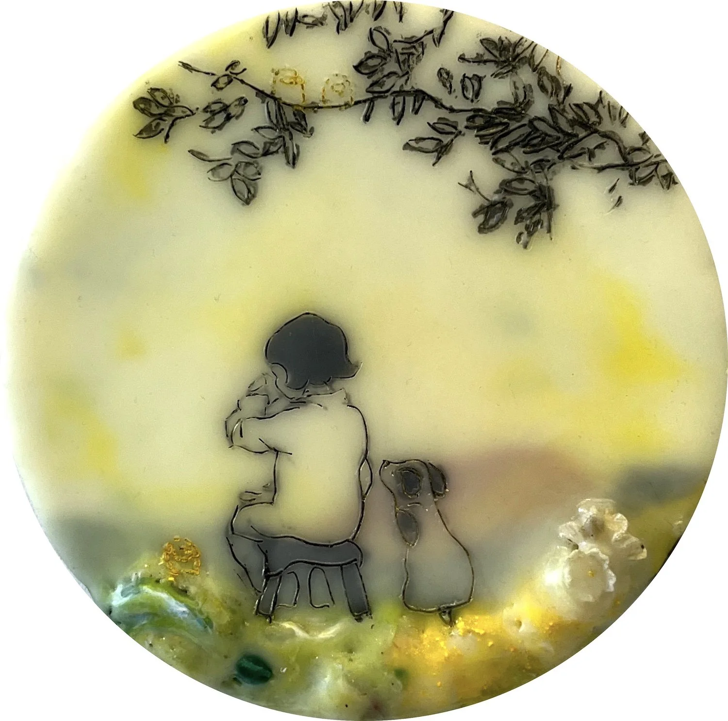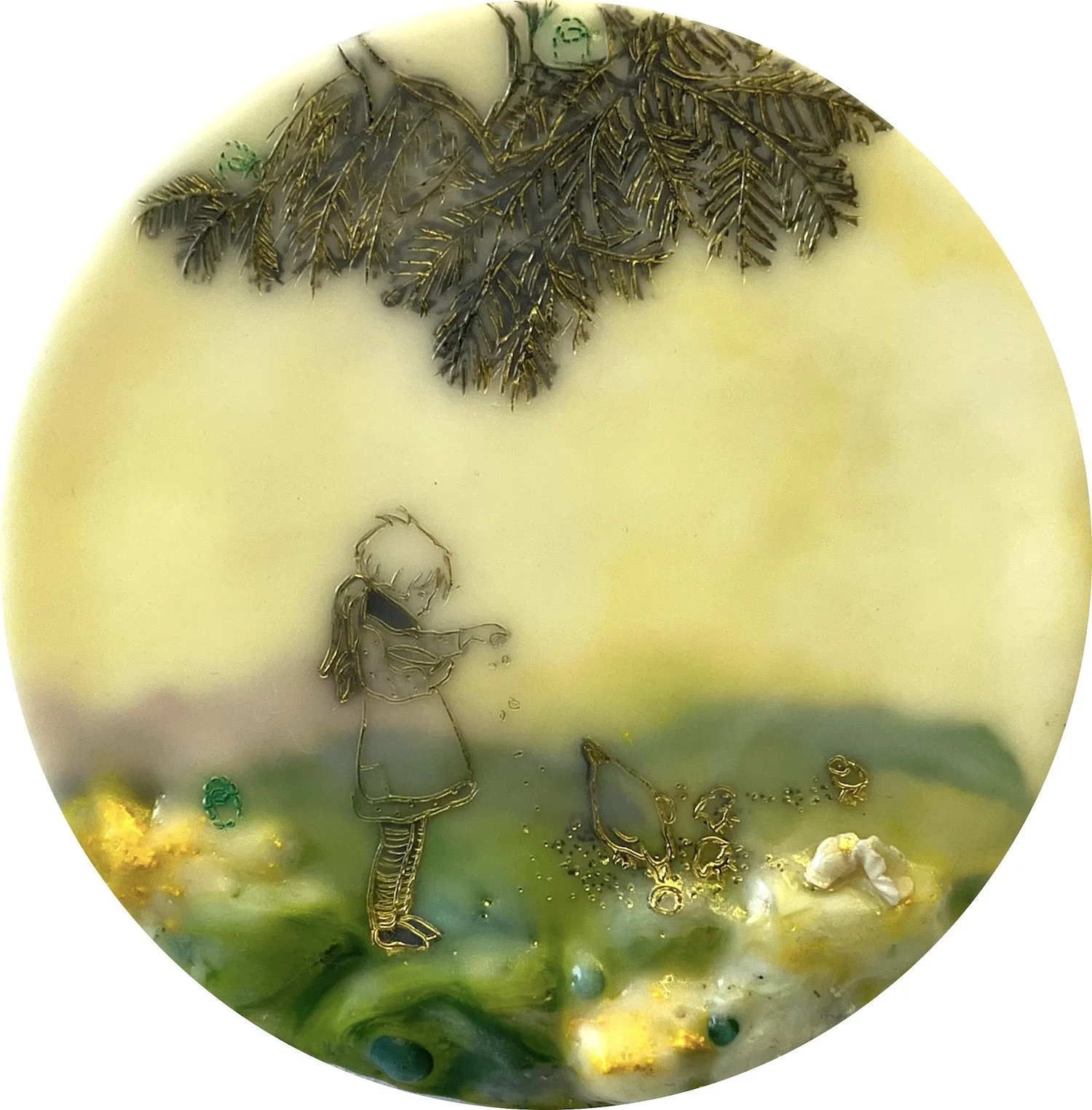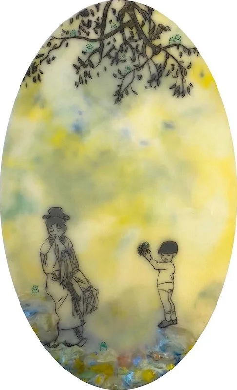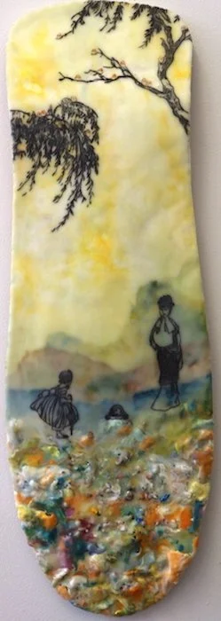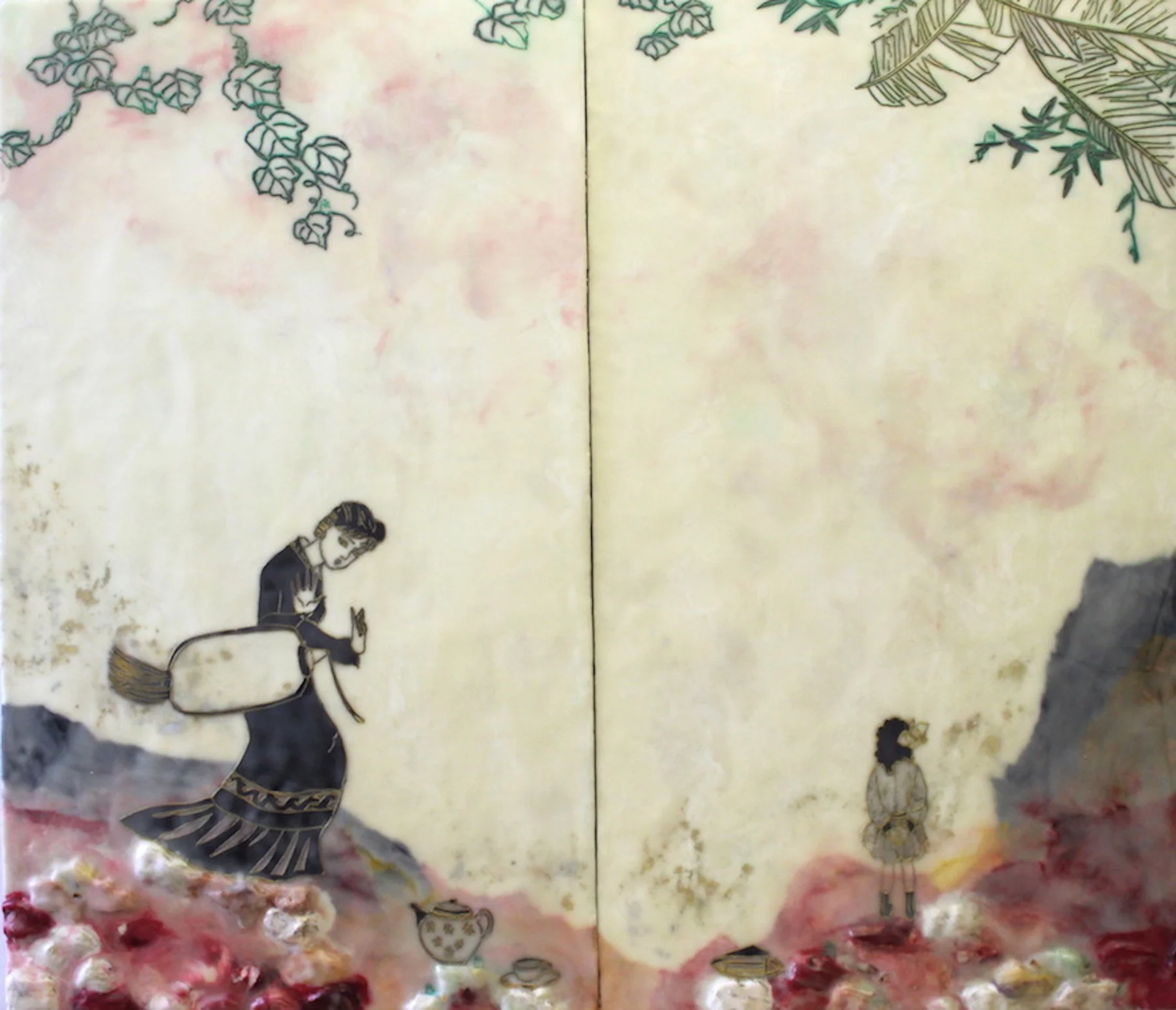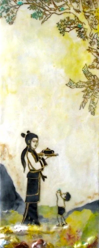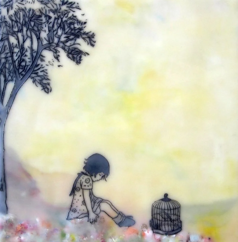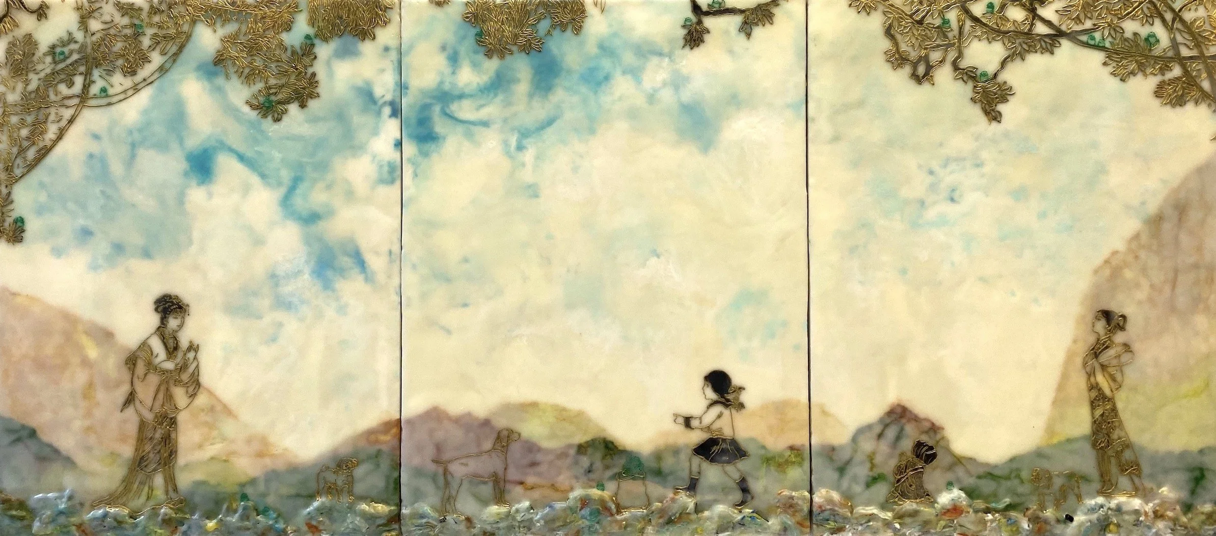 To address the process of cultural encounter and entanglement, encaustic on wood panels are used to create cross-cultural narratives by juxtaposing appropriated images from vintage children’s books and other found images. Mixed Media include pigments from Morocco and India, volcanic ash from Ecuador, rice paper, metallic leaf, beads and circuit board components. Each material becomes a cultural signifier. Each painting contains 25 to 30 layers of encaustic, metaphorically representing layering of cultures, identities, and places.